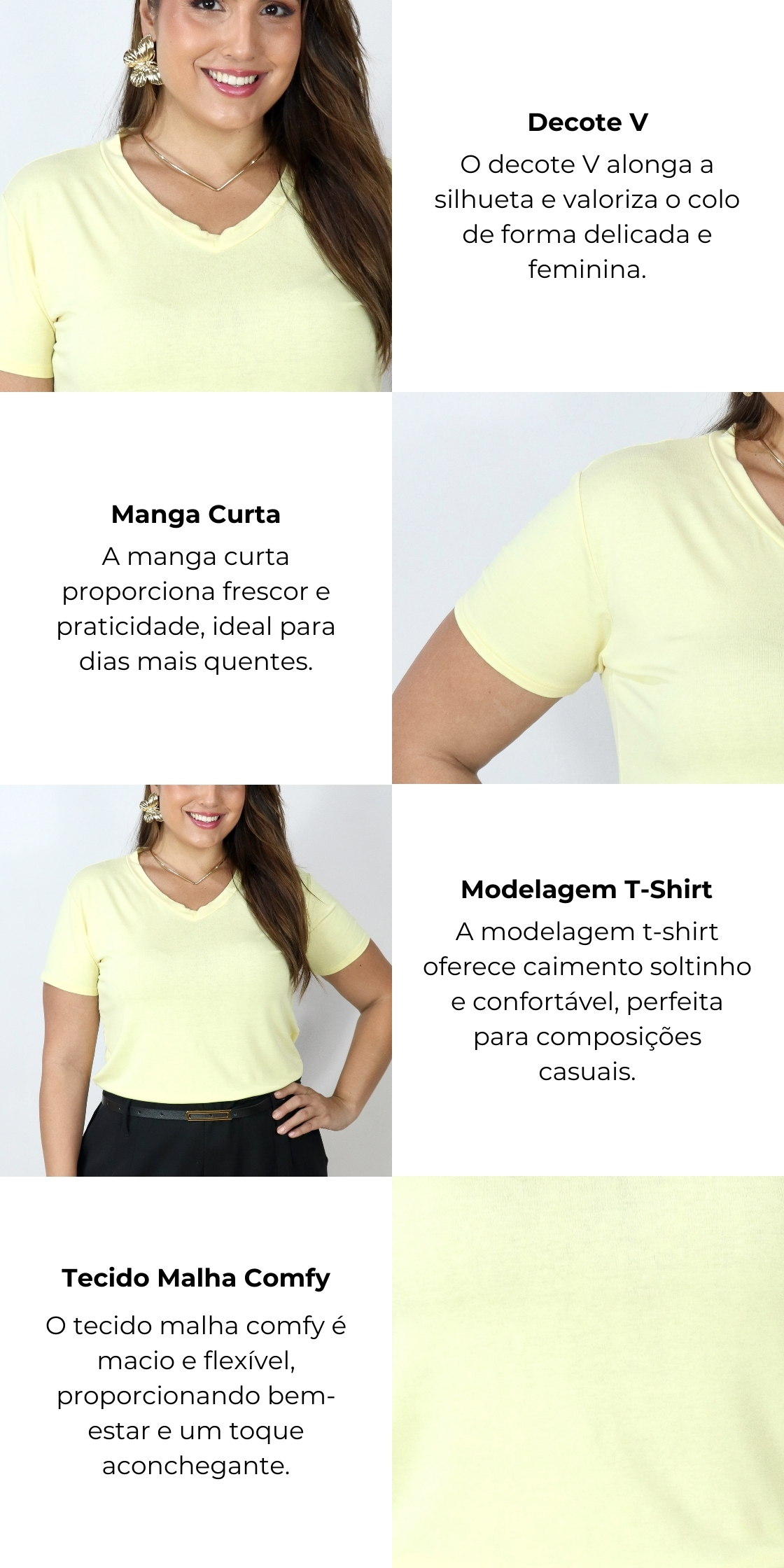 Com acabamento diferenciado e caimento impecável, a Blusa Feminina Decote V Manga Curta Malha Comfy é a peça-chave para quem busca conforto e estilo em uma única produção.