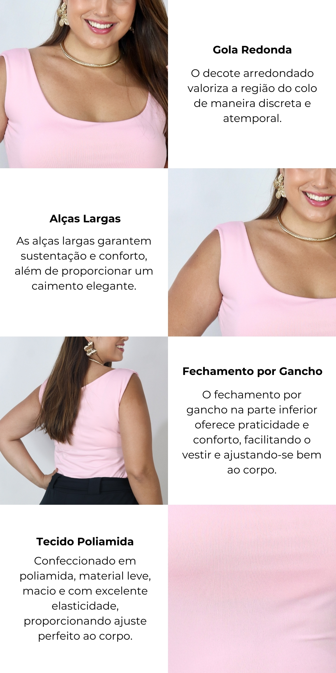 O Body Feminino Alça Larga Decote Redondo é uma peça-chave para composições versáteis. Confira algumas sugestões: