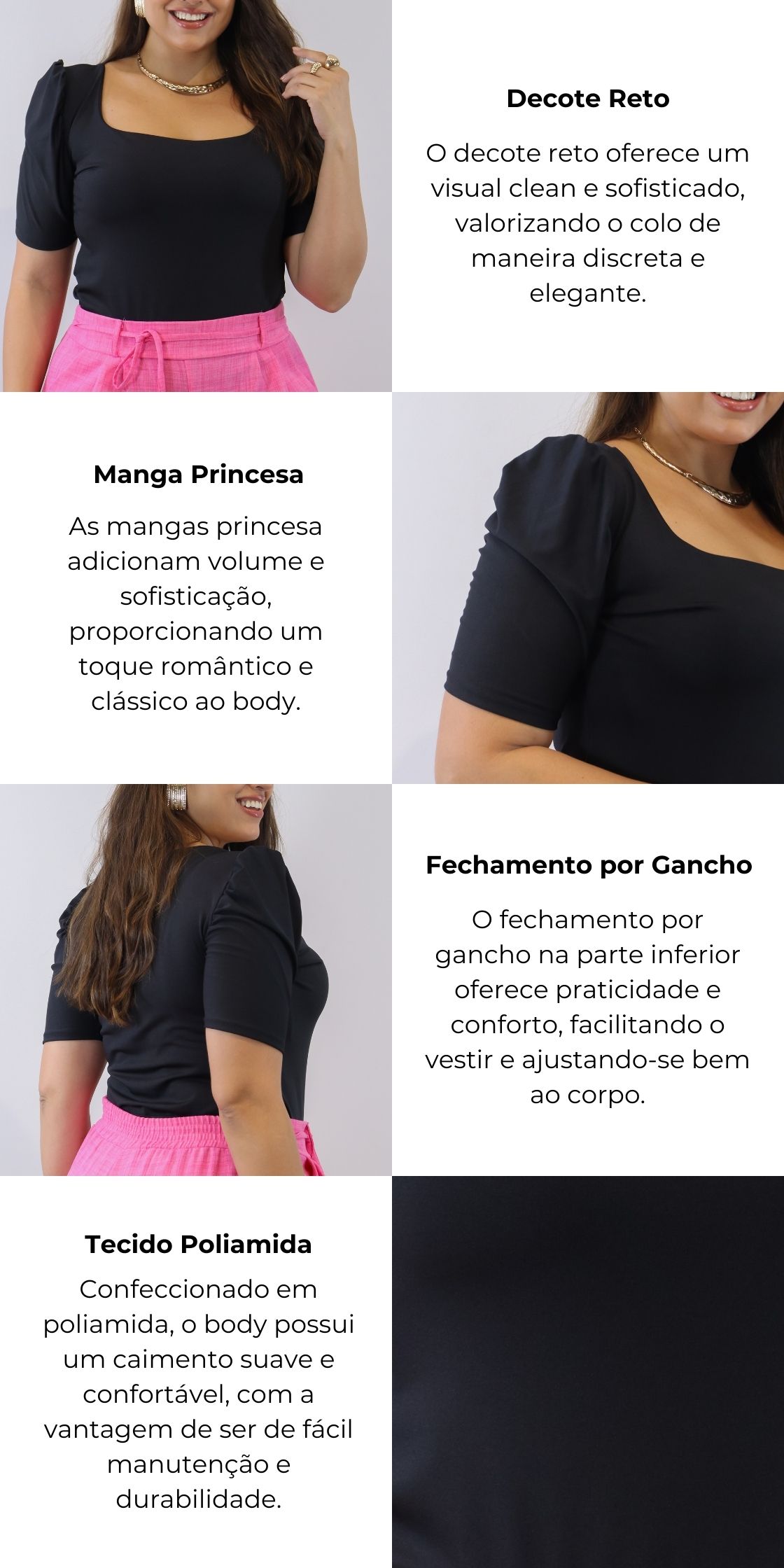 O Body Feminino Manga Princesa Decote Reto é uma peça essencial no guarda-roupa de quem busca elegância, conforto e sofisticação em um único item. Seu design moderno e os detalhes que valorizam a silhueta tornam esta peça uma escolha perfeita para composições versáteis e estilosas.
