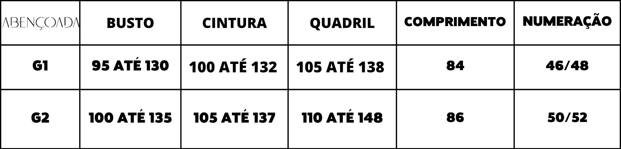 Tabela de Medidas: